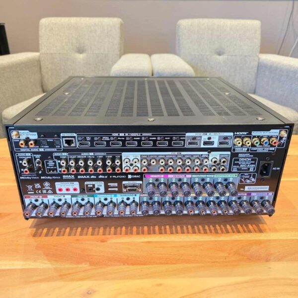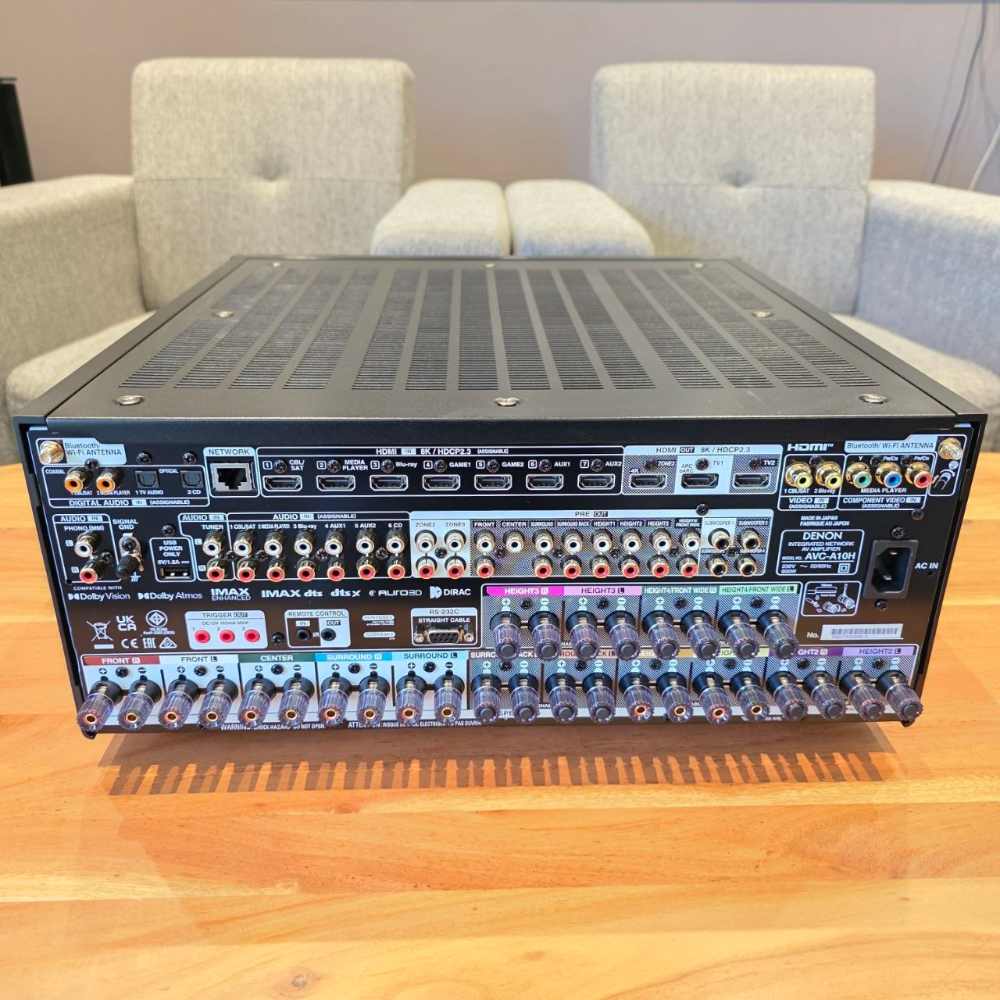La connectique de l’ampli Denon AVC-A10H est extrêmement généreuse avec notamment 7 entrées et 3 sorties HDMI, de nombreuses entrées et sorties analogiques (dont une phono) et numériques (optiques et coaxiales, USB) ainsi que 4 sorties pour caissons de basses avec réglages indépendants.