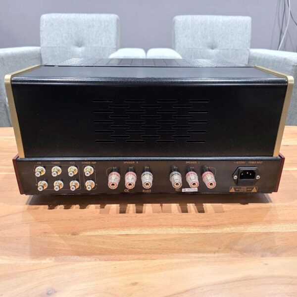 Cet amplificateur intégré propose un schéma double mono. Il propose également un redressement non pas par diodes mais via un tube de redressement par canal, ce qui est très rare dans cette gamme.