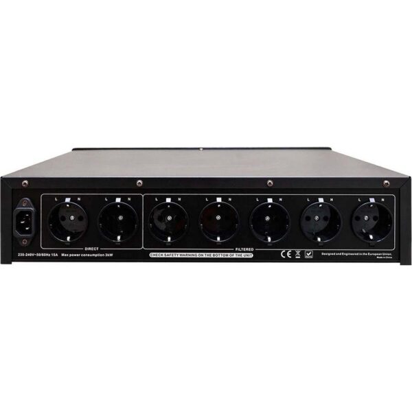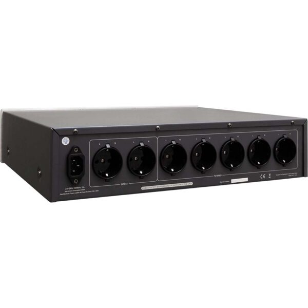 Le PF 2000 est équipé de plusieurs prises secteur Schuko, combinant des sorties filtrées, filtrées + DC blocker, et directes. Cette disposition permet de brancher différents types d’équipements — sources numériques, amplificateur, préampli, lecteurs — chaque sortie étant adaptée selon la sensibilité aux perturbations. Un interrupteur de polarité / détecteur de phase peut être inclus pour s’assurer que la phase secteur est correctement orientée.
