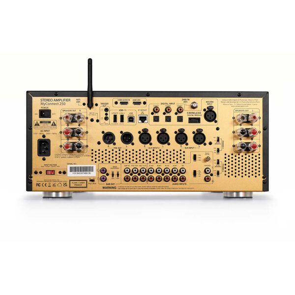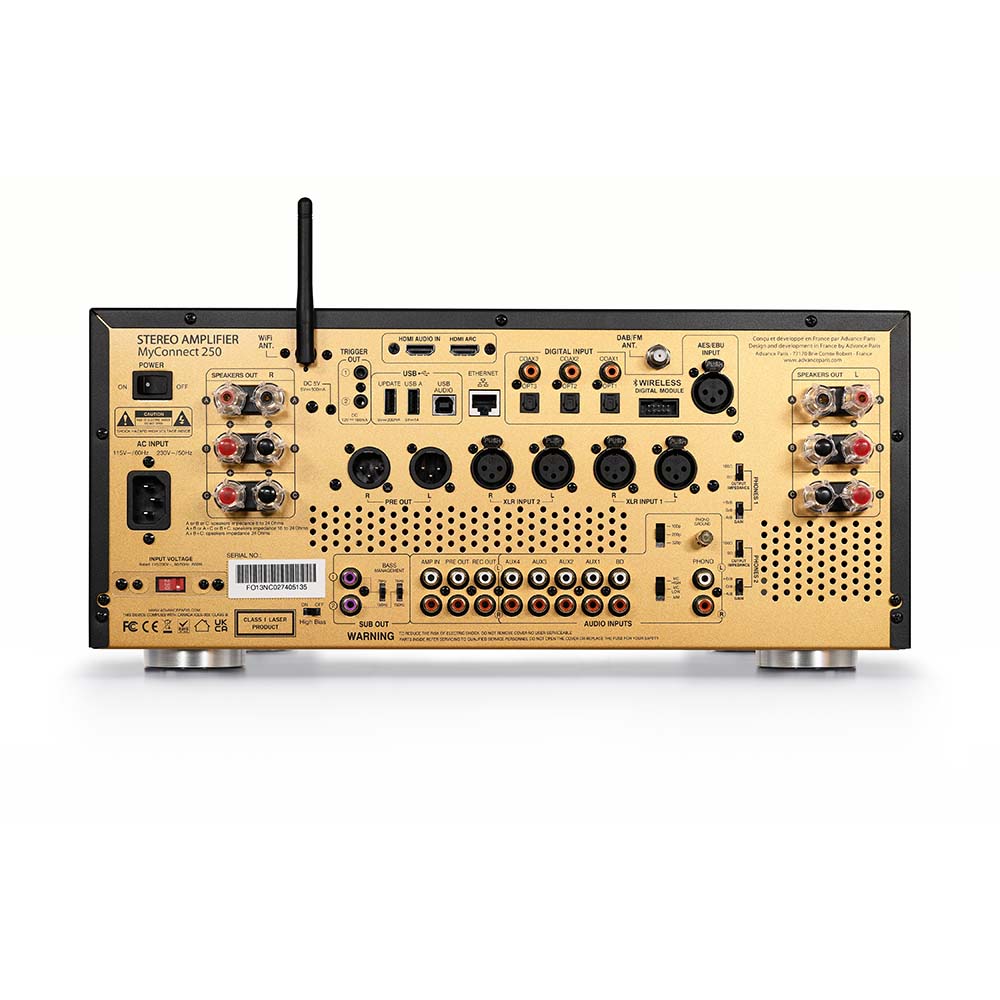 Ce modèle intègre un large éventail de fonctionnalités : un lecteur CD, un tuner FM/DAB, des entrées phono compatibles avec cellules MM et MC, des entrées numériques (USB, optique, coaxiale, HDMI, AES/EBU) et analogiques (RCA et XLR). Pour une écoute connectée, le MyConnect 250 permet le streaming via Ethernet ou Wi-Fi, avec compatibilité Spotify Connect et applications dédiées comme PlayStream.