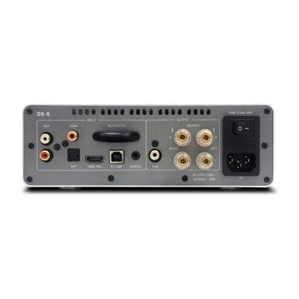 Doté d’un DAC ESS ES9039Q2M, le DX-5 restitue une plage dynamique étendue, un rapport signal/bruit exceptionnel et une neutralité sonore exemplaire. Il propose une connectivité riche : USB-PC (jusqu’à 32-bit/384 kHz et DSD), entrées coaxiale et optique (jusqu’à 24-bit/192 kHz), Bluetooth aptX HD & AAC, entrée analogique RCA, HDMI ARC avec commandes CEC pour intégrer facilement une TV, et une sortie subwoofer pour systèmes 2.1.