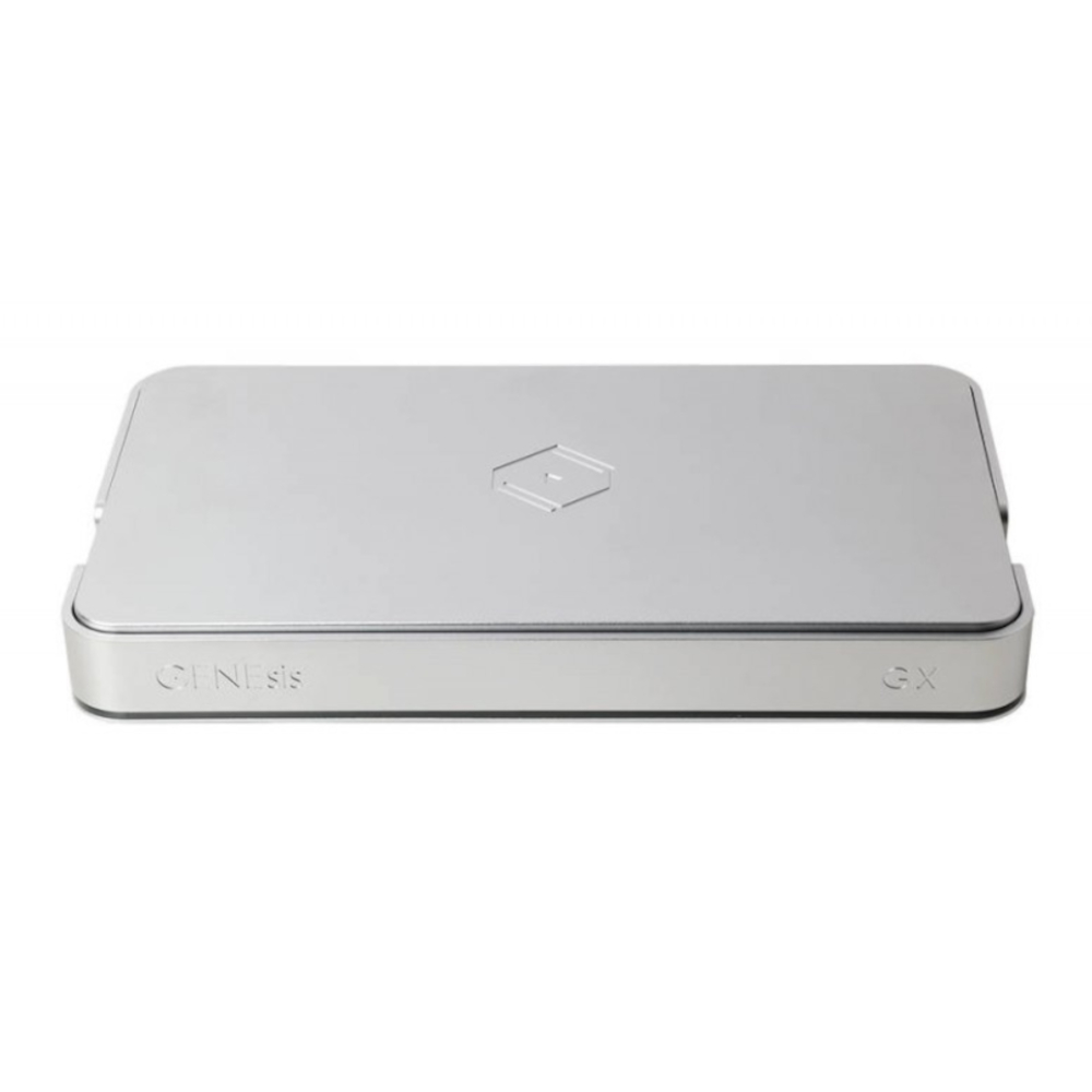 Le châssis du Genesis GX est construit en deux couches : une couche intérieure en acier galvanisé et une couche extérieure en alliage d’aluminium. Cette structure vise à combiner blindage électromagnétique, amortissement des vibrations et contrôle des courants de Foucault. De plus, l’appareil repose sur trois pieds « Resonance Control » en acier inoxydable, qui dissipent les énergies mécaniques internes et externes, réduisent les résonances et abaissent le niveau de bruit (mécanique ou statique).
